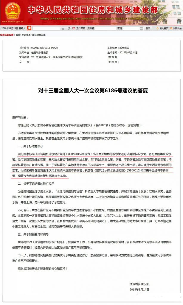國家住房城鄉(xiāng)建設部在《對十三屆全國人大一次會議第6186號建議的答復》中公開表態(tài):為鼓勵引導在建筑生活飲用水系統(tǒng)中應用不銹鋼供水管,已在《建筑給水排水設計規(guī)范》(GB50015)修訂稿中將不銹鋼管、銅管作為優(yōu)先選擇的供水管材,即將發(fā)布實施。